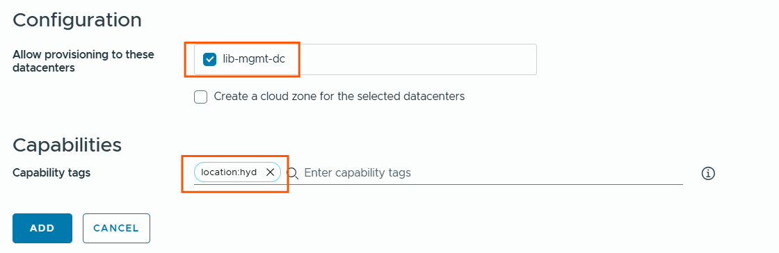 Next in the configuration section, I have selected the datacenter discovered in this workload domain. Added capability tag “location:hyd”.