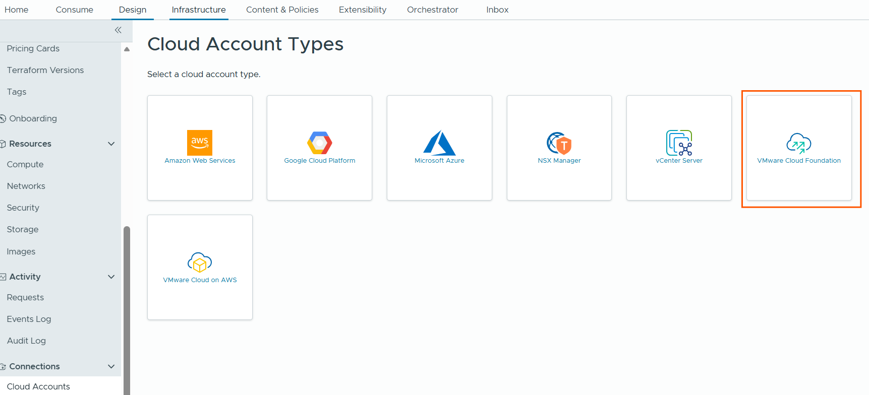 Next, we will create cloud account for vCenter.