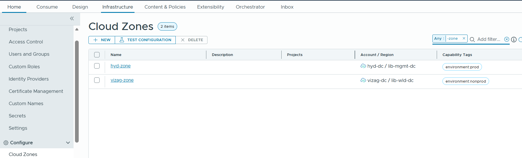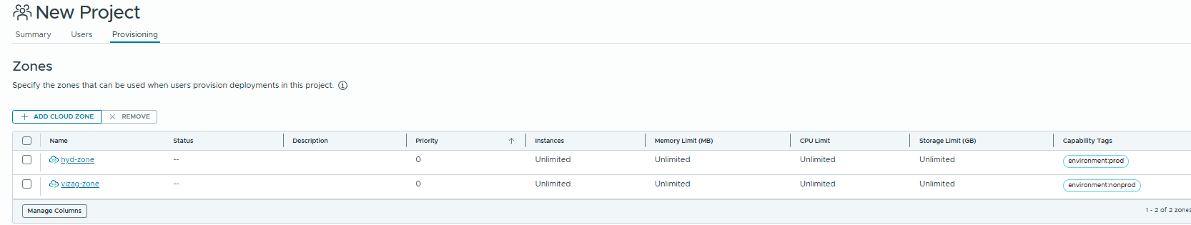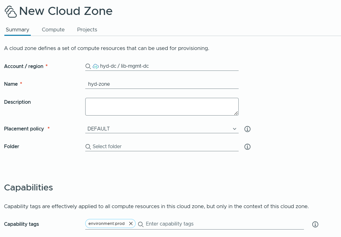 Next we will need to create cloud zones and select the appropriate compute. As per the sample requirements, we want to represent hyd-dc as prod, and vizag dc as nonprod.