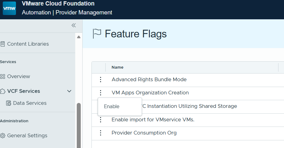 Let’s log into the VCFA provider portal, enable the feature flag “VM Apps Organization Creation”.