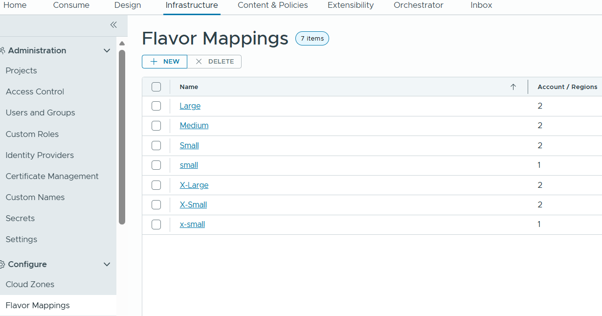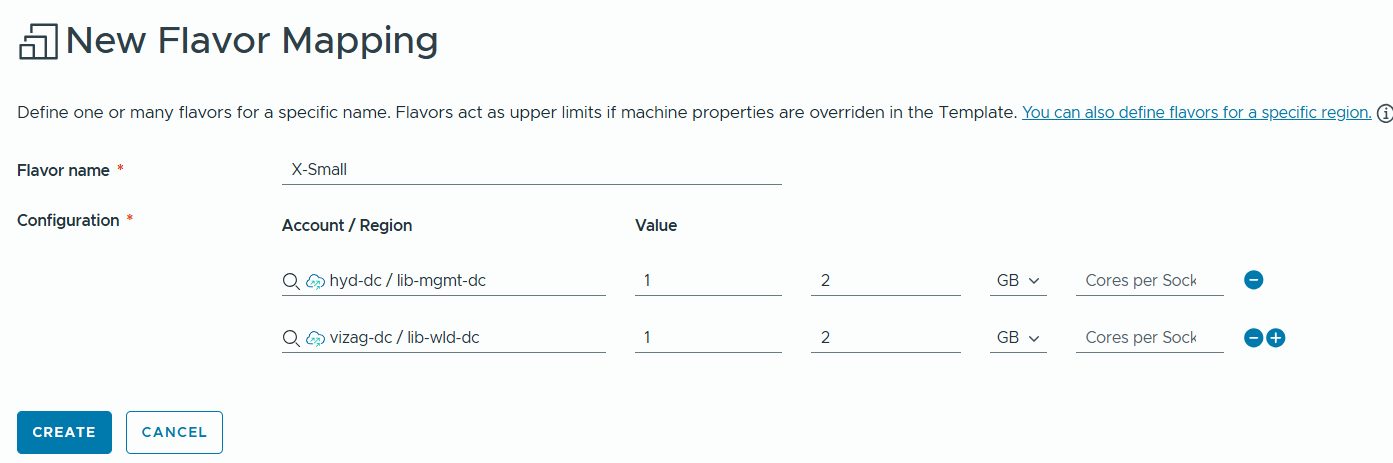 With Flavor mappings, we can specify how much cpu and memory resources can be used by VM, VM deployment requests can refer this flavor mapping to get the resource size allocation. I have created X-Small, Small, Medium, Large, X-Large for both regions.