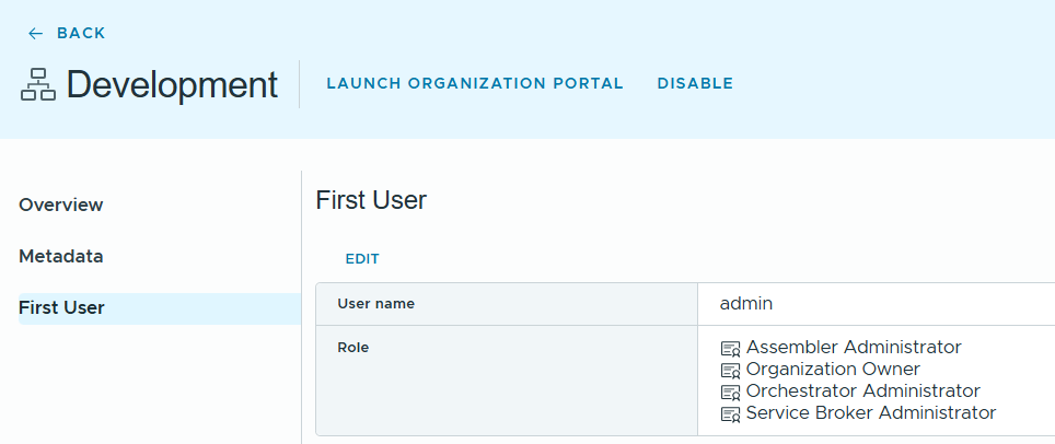 Provide the name for the organization, add first user and assign administrator roles to the first user.