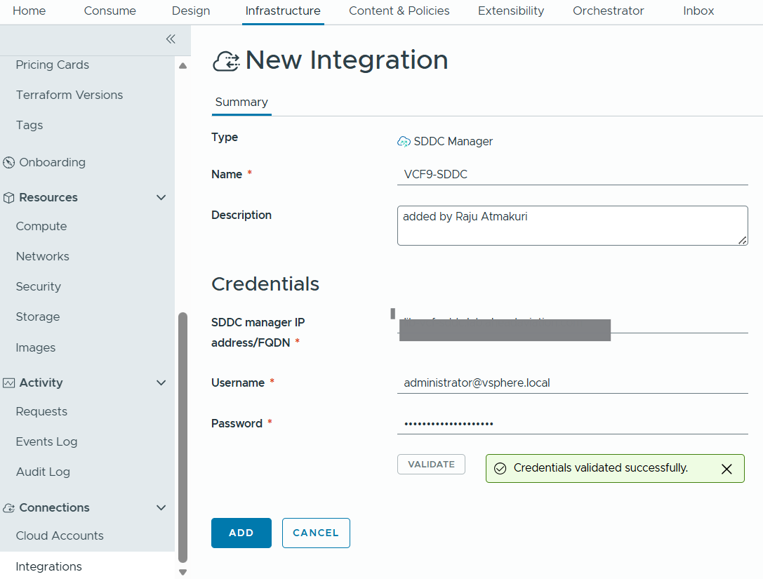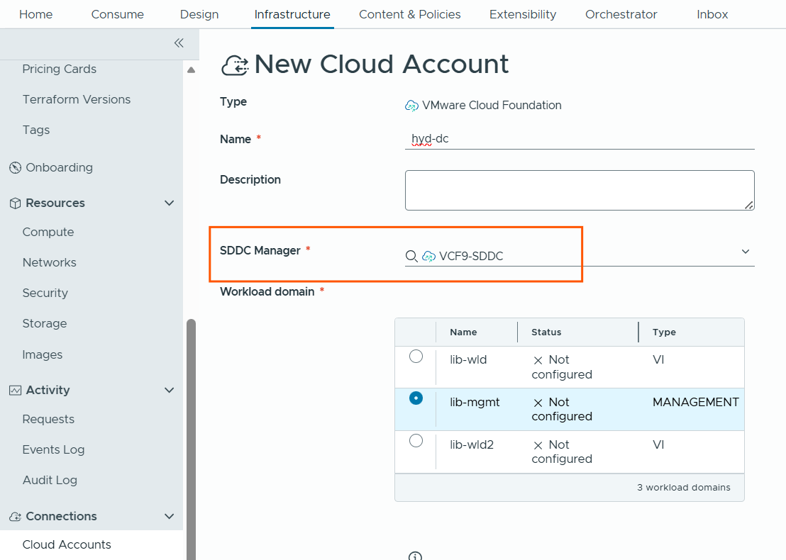 Go to connections –> Cloud Accounts –> Add Cloud Account -> select VCF cloud account type –> Choose name, select the SDDC Manager instance we created earlier, and it will display available workload domains, now select the workload domain, provide vCenter details.