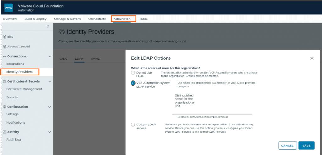 In the Administer tab, click on Identity providers, select LDAP and select VCF Automation system LDAP