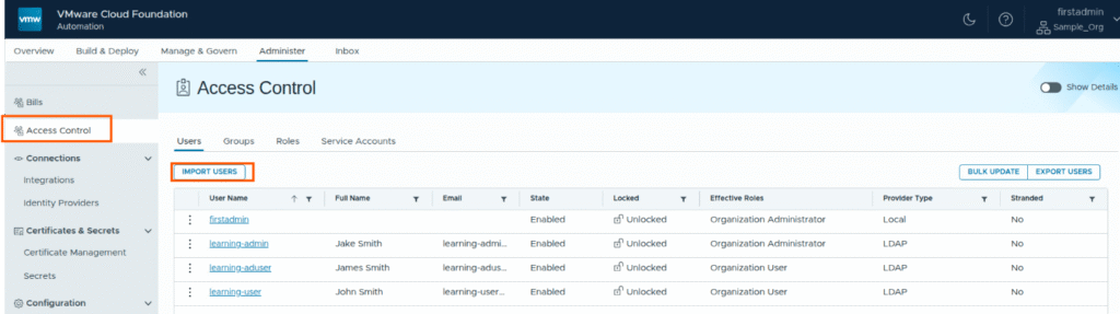 Then go to Access control section, import users into the organization level.