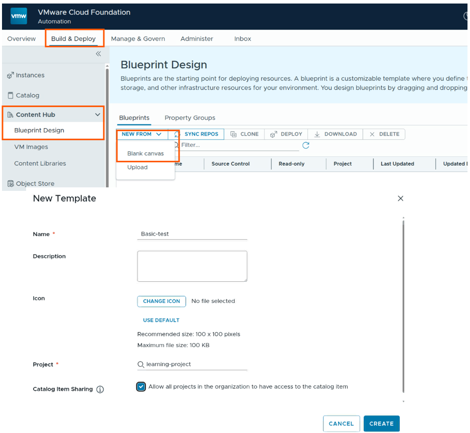 Now we can create a blueprint and publish it, or we upload a OVA/OVF image files and publish them to Catalog.