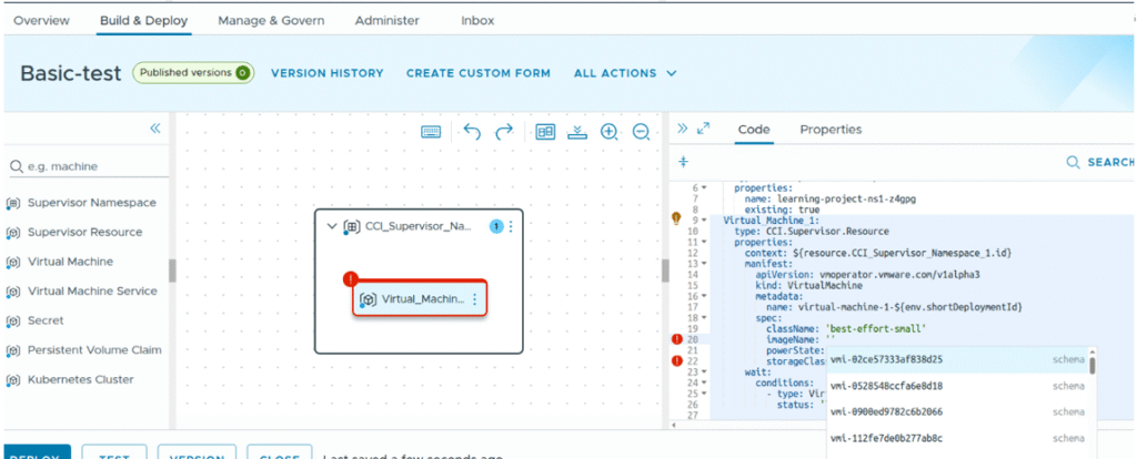 Create the blank canvas, and drag the virtual machine object to canvas page. and provide the VM properties, namespace properties.