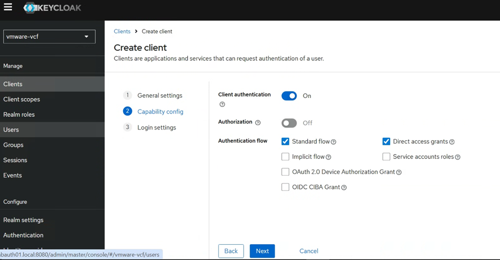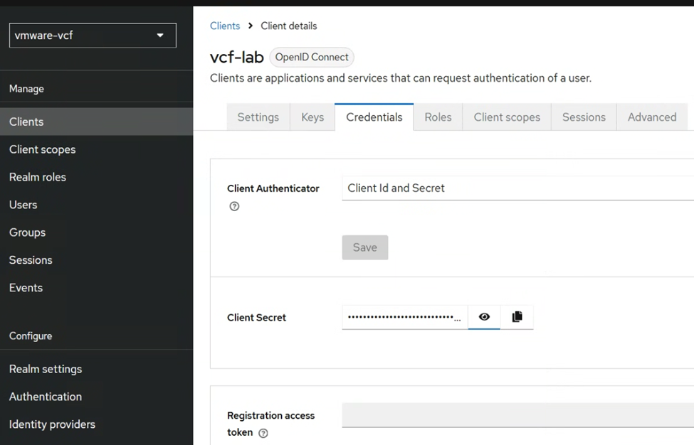 Next we will create the client, inside the vmware-vcf Realm we created just now. Note the Client ID here.