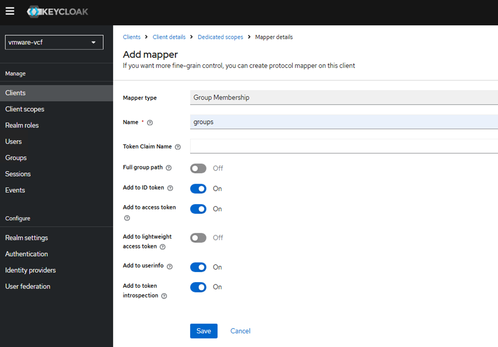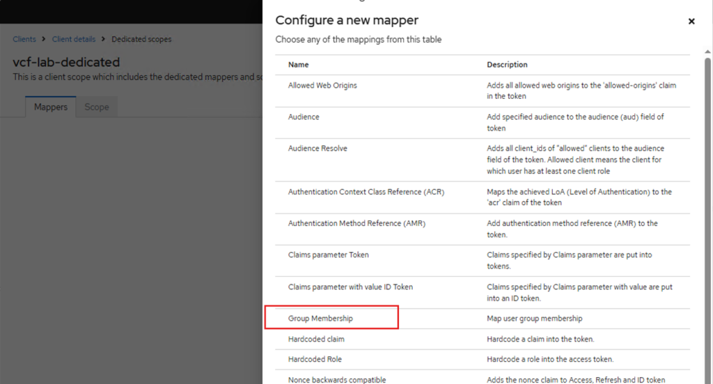 Next, we need to create a client scope, go to the vcf-lab client, click on “Client scopes” tab. Click on the “vcf-lab-dedicated” scope and create a new mapper.