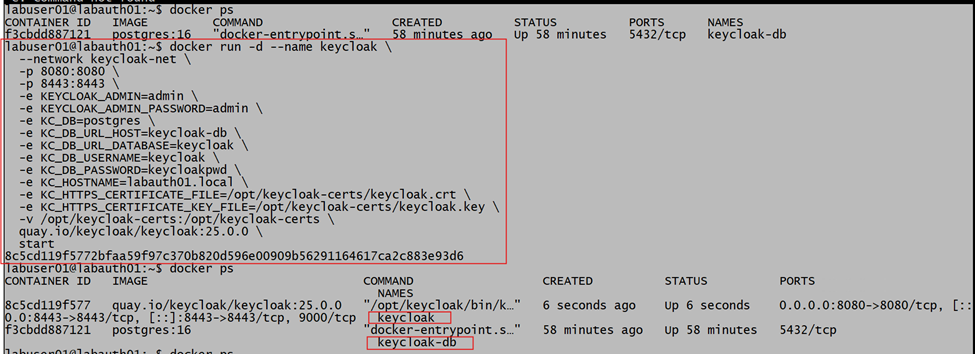 Now we will deploy the Keycloak service in production mode. and confirm that both DB and Keycloak services are up and running.