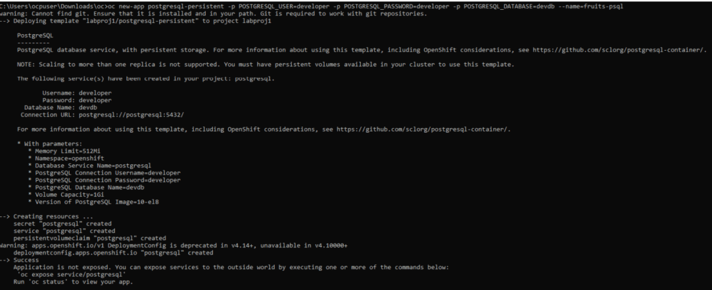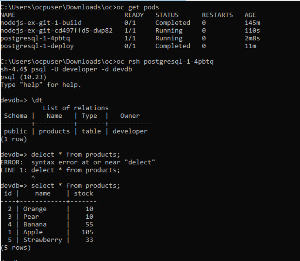 C:\Users\ocpuser\Downloads\oc>oc set env deployment/nodejs-ex-git POSTGRESQL_USER=developer POSTGRESQL_PASSWORD=developer POSTGRESQL_DATABASE=devdb POSTGRESQL_HOST=postgresql POSTGRESQL_PORT=5432 deployment.apps/nodejs-ex-git updated