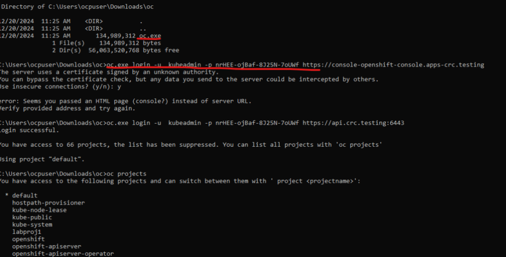 6. Now we can login to our openshift local cluster using the console URL shown from the output of crc start command (refer previous screenshot)., which is running locally on yourVM/Laptop and we can deploy an application for testing.