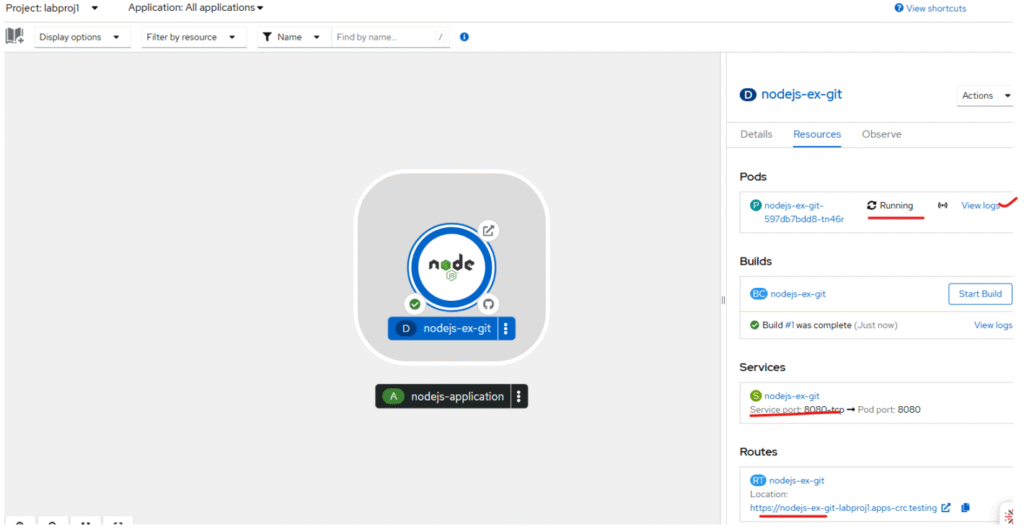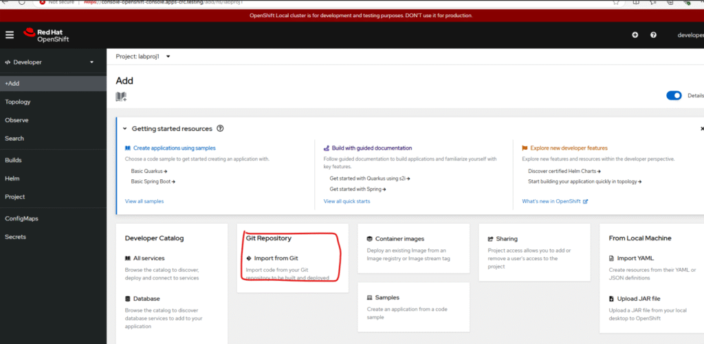 1. Login as developer, go to Topology, select your project ‘labproj1’ from dropdown.