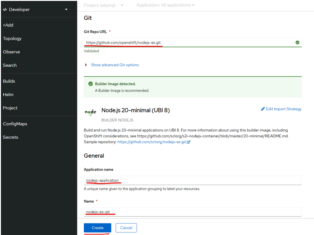 Provide the git URL and fill in the application name and other details, click on Create