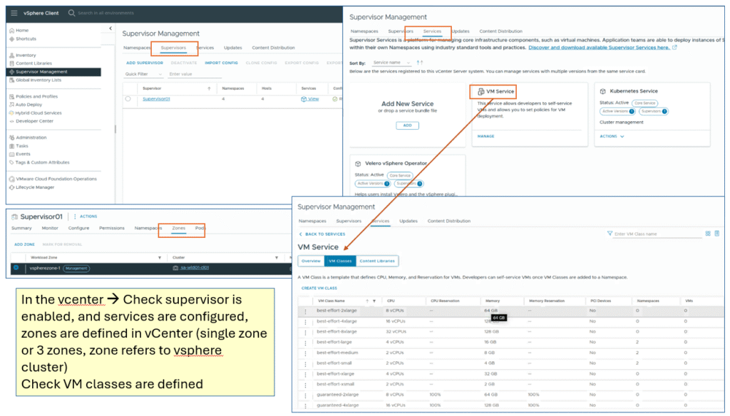 2. vSphere supervisor services are enabled on workload domain vCenter, this is important for enabling end users (Devops/VM admins/Platform team) to consume resources in a self-service manner. They will be able to request VMs, vSphere Kubernetes clusters, and vSphere pods.