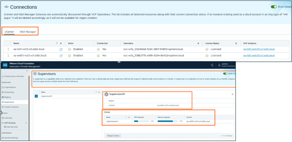 Login VCF Automation, and check for vCenter and NSX Manager connections and supervisor configuration, these should be discovered automatically.