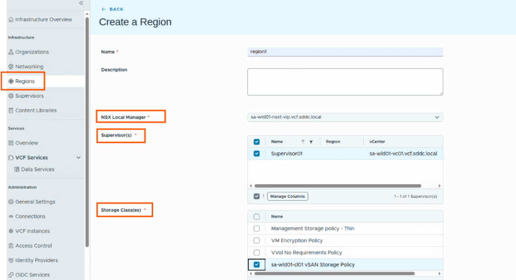 A region is a construct that defines which vCenters and vSphere clusters(supervisors), and which NSX Managers/Edge clusters will be made available for consumption by organizations and projects.