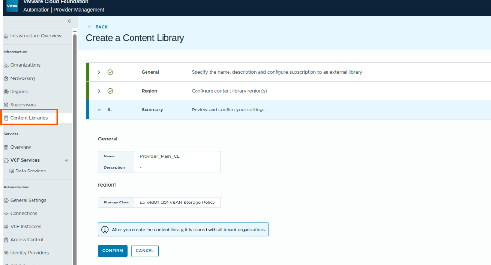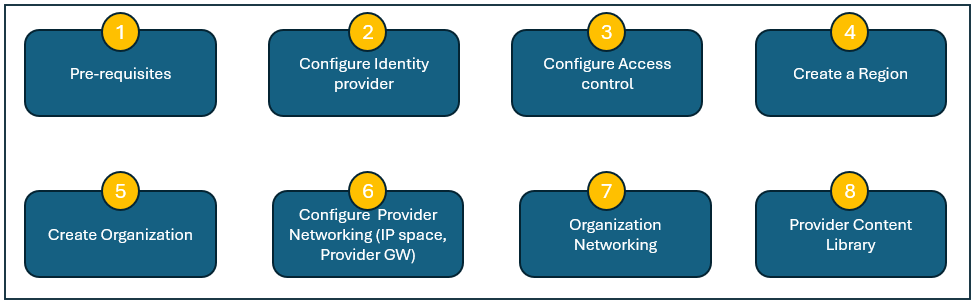 With this, we have prepared our first organization, mapped it to the region, assigned region quotas, configured the networking, then setup a provider content library for the region level.