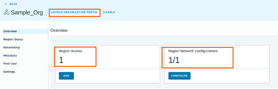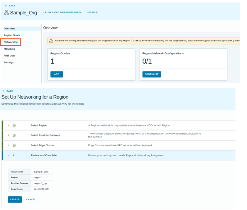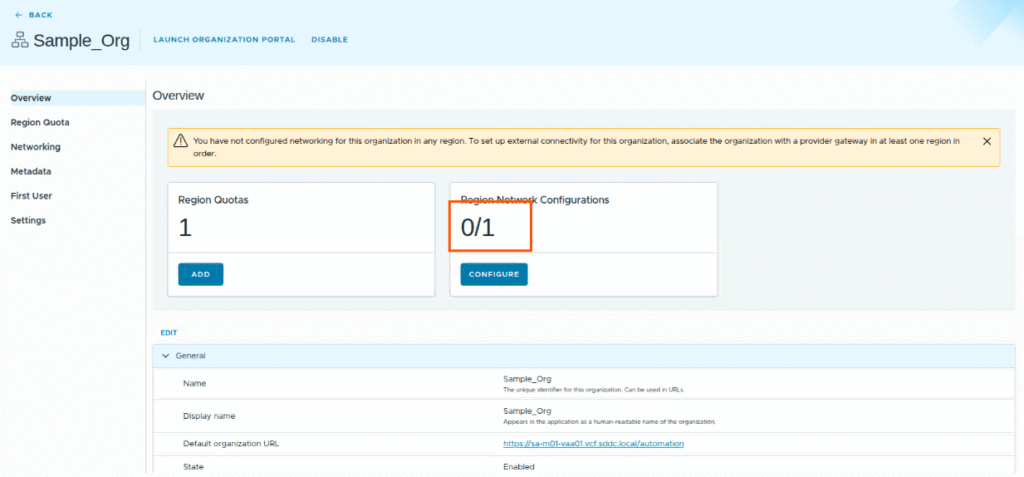 Now you see Sample_Org is ready, and it says networking is not configured for this organization.