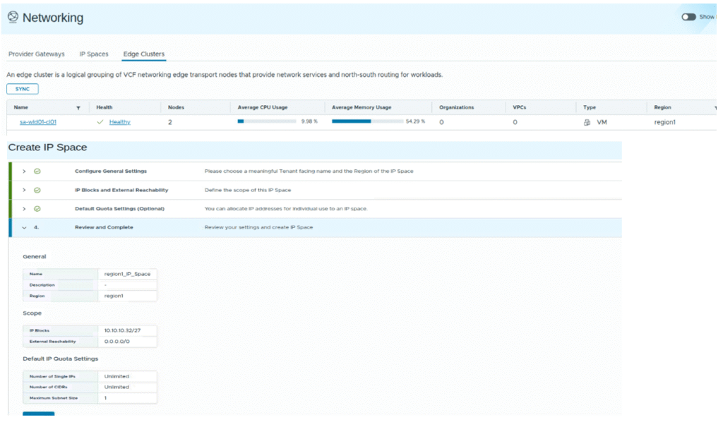 Verify edge cluster is discovered, click on IP spaces , create an IP space for region1. Then we will create Provider gateway.