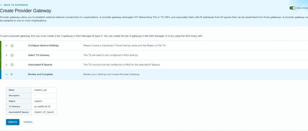 You will select the region, provider gateway, select the edge cluster and Create.