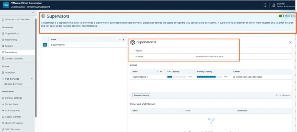 - Supervisor: The core component that manages physical infrastructure resources and runs workloads. In general there will be one Supervisor for one vCenter. A supervisor is a capability that turns vSphere into a platform that can host multiple IaaS services. Supervisor defines the scope of vSphere IaaS control plane on vCenter. A supervisor is a collection of one or more clusters on a vCenter instance and can span across multiple zones for fault tolerance.