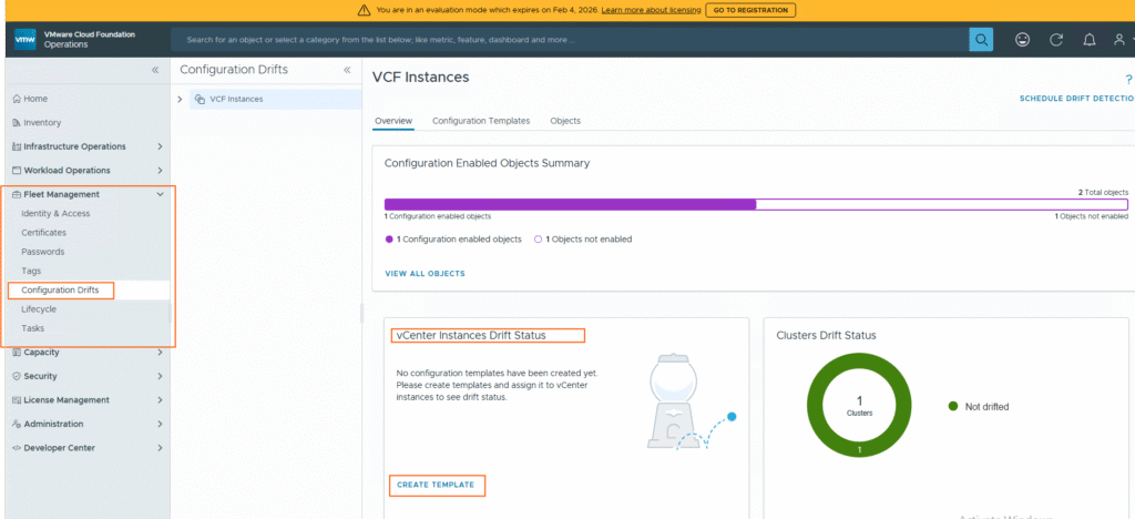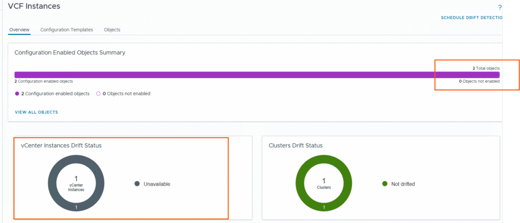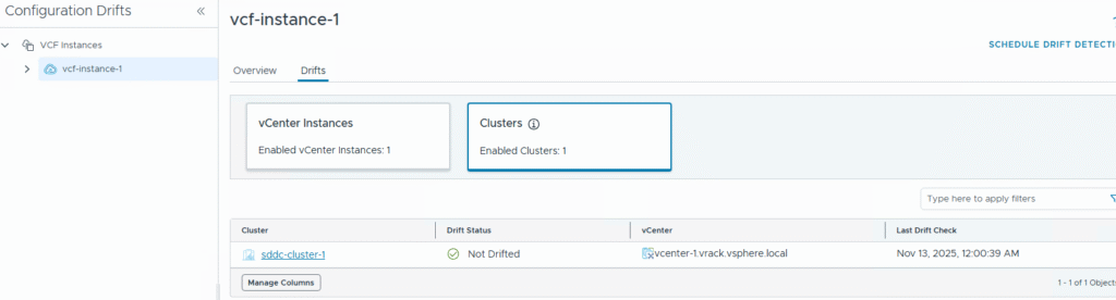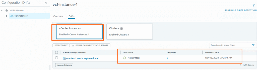 This is how you can find the drift in the vCenter configuration; you can apply the template to all vCenters in your VCF fleet and monitor the drift status and take required actions.