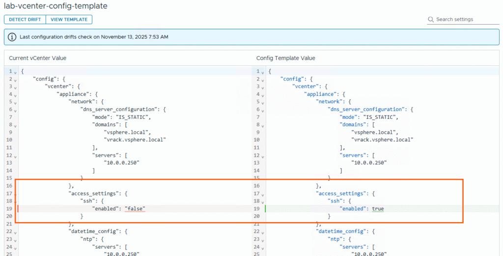In this way we can ensure that standardized settings are applied across all vCenters, and incase a specific configuration is changed on a vCenter, configuration drift will detect the change and report it as drift detected. Then Admin can remediate it.