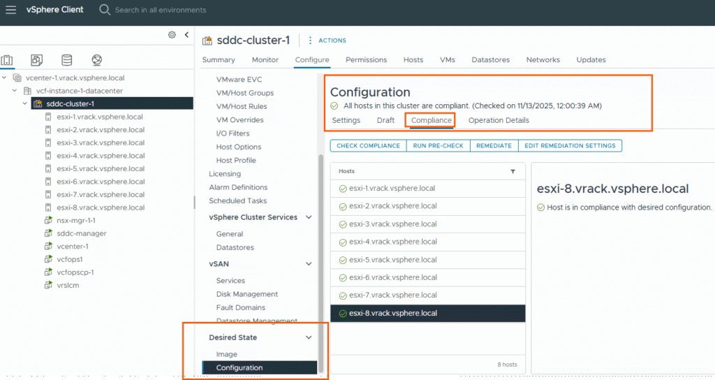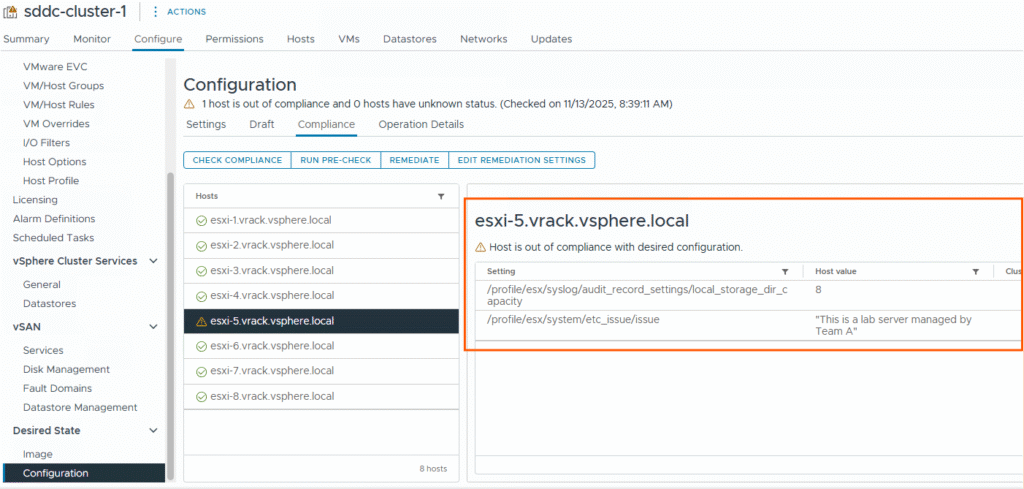 After changing few settings on host5, we can run a compliance check from vSphere client or run a drift detection job from VCF Operations console.