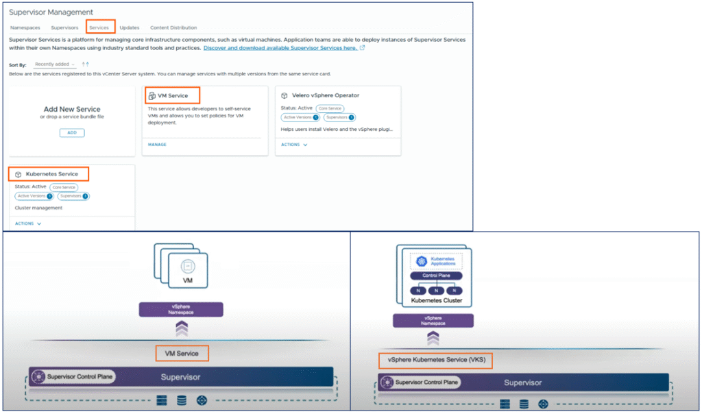 With supervisor services feature you can also deploy VMware certified Kubernetes operators as services in the vSphere supervisor control plane. These optional services deliver Infrastructure-as-a-Service components and tightly-integrated Independent Software Vendor services to developers. You can install and manage Supervisor Services on the vSphere Supervisor environment so that to make them available for use with Kubernetes workloads.